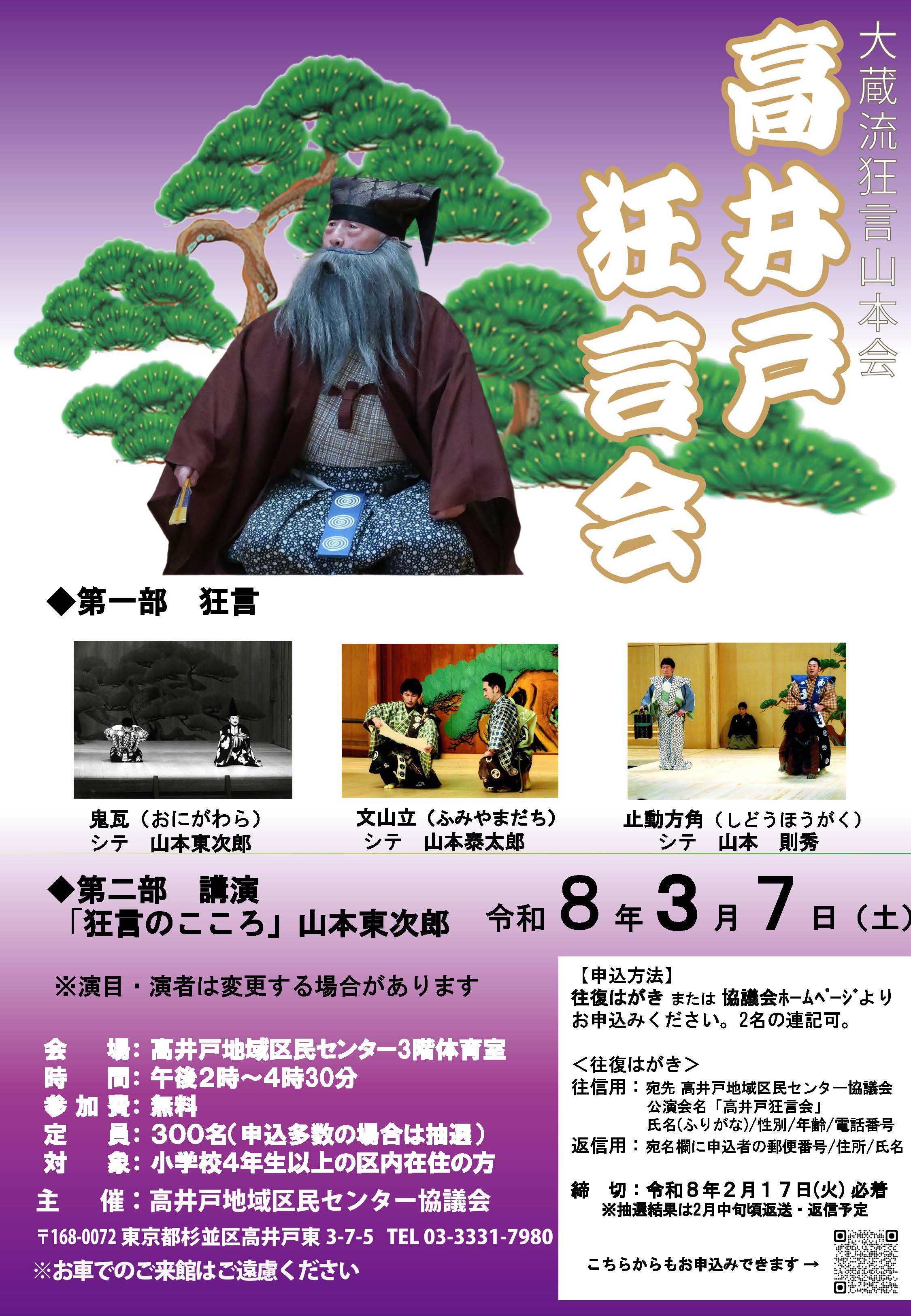 【申込受付を終了しました】3月7日(土)「高井戸狂言会」を開催します。